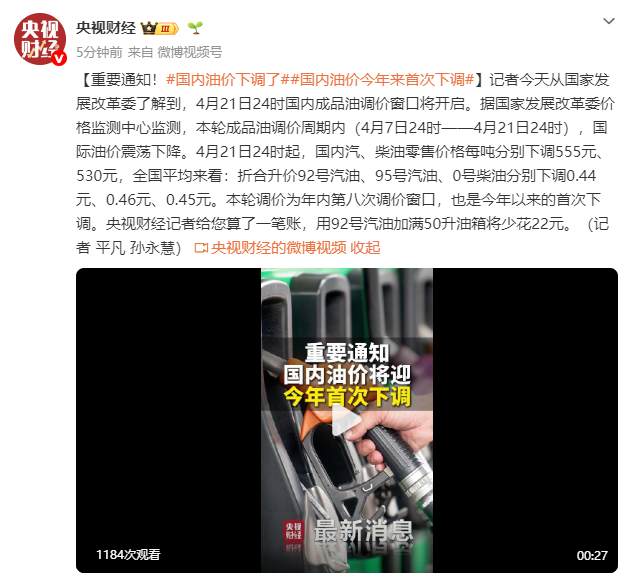 记者今天从国家发展改革委了解到,4月21日24时国内成品油调价窗口将开启。据国家发展改革委价格监测中心监测,本轮成品油调价周期内(4月7日24时——4月21日24时),国际油价震荡下降。4月21日24时起,国内汽、柴油零售价格每吨分别下调555元、530元,全国平均来看:折合升价92号汽油、95号汽油、0号柴油分别下调0.44元、0.46元、0.45元。本轮调价为年内第八次调价窗口,也是今年以来的首次下调。央视财经记者给您算了一笔账,用92号汽油加满50升油箱将少花22元。(记者 平凡 孙永慧)
