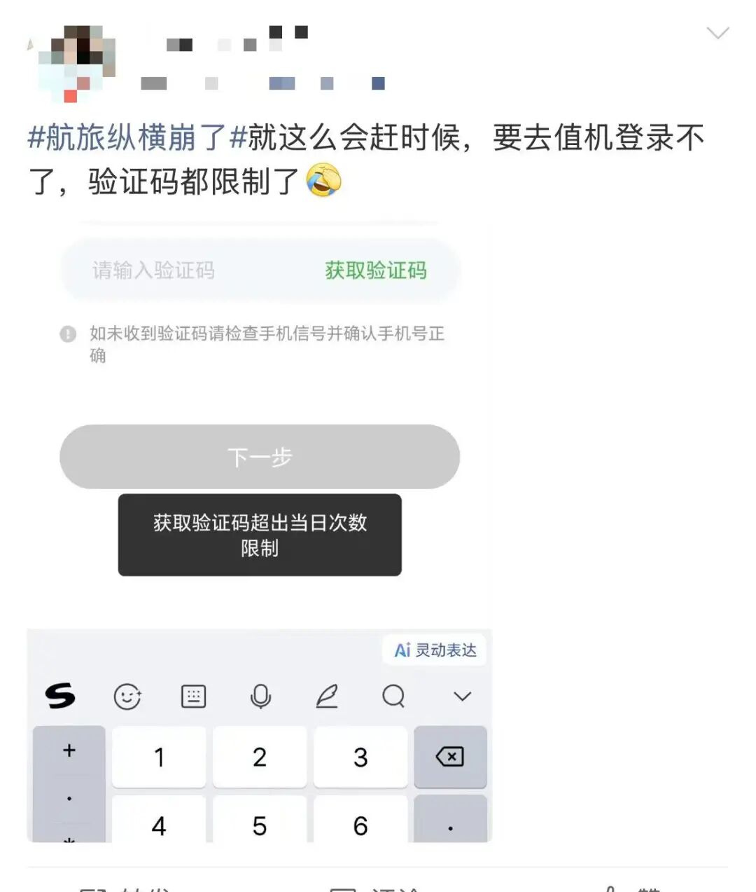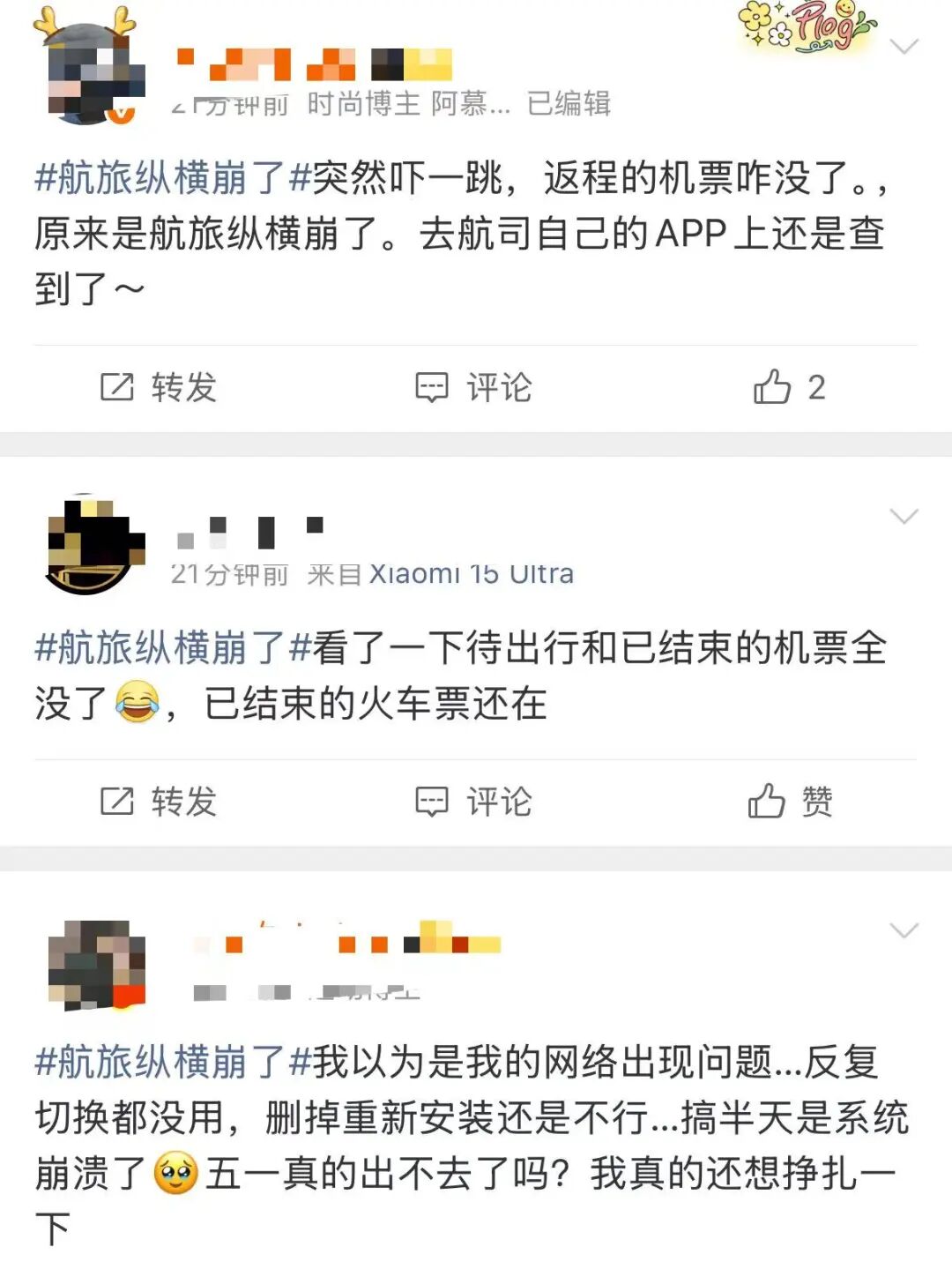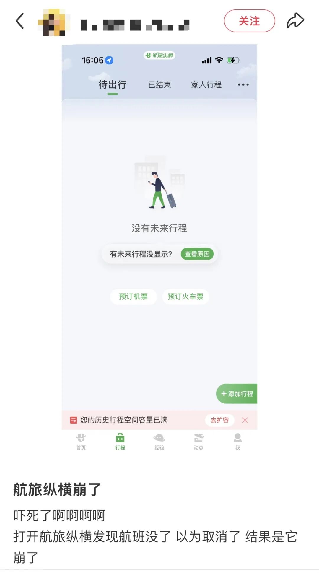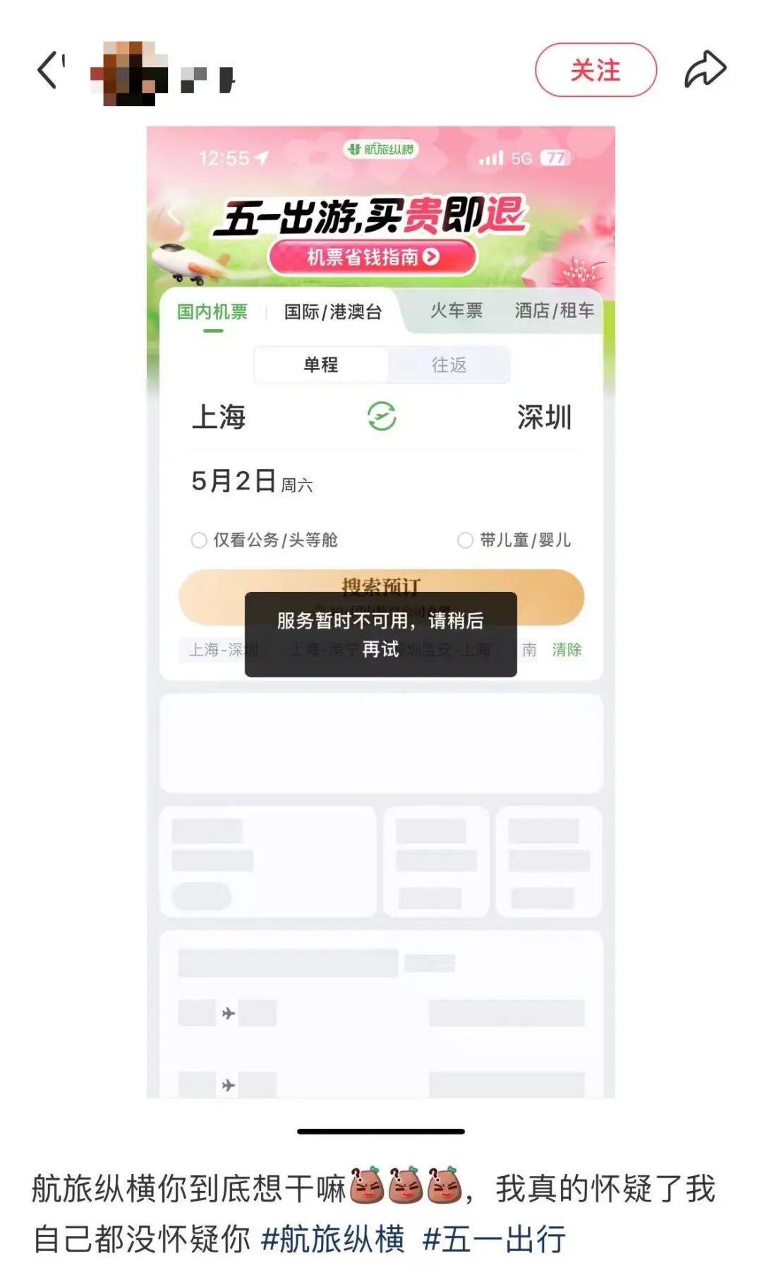 随后“航旅纵横崩了”话题词