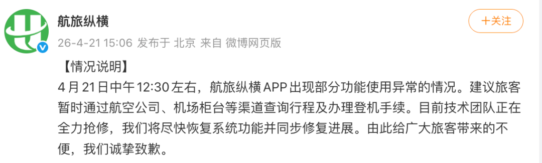 今天15时许,航旅纵横发布情况说明称:4月21日中午12:30左右,航旅纵横APP出现部分功能使用异常的情况。建议旅客暂时通过航空公司、机场柜台等渠道查询行程及办理登机手续。目前技术团队正在全力抢修,将尽快恢复系统功能并同步修复进展。